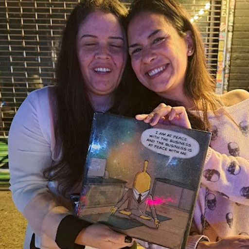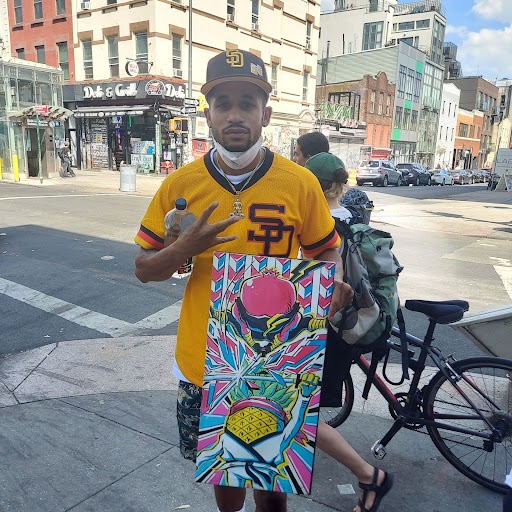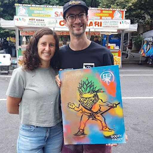 "We met Mike while he was out vending in NYC! We were visiting the city on holiday from New Zealand. We loved learning about each character and all the stories in the comics. We were lucky to grab this original piece of stencil featuring the Ninja Pineapple."