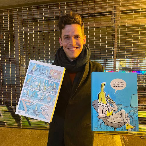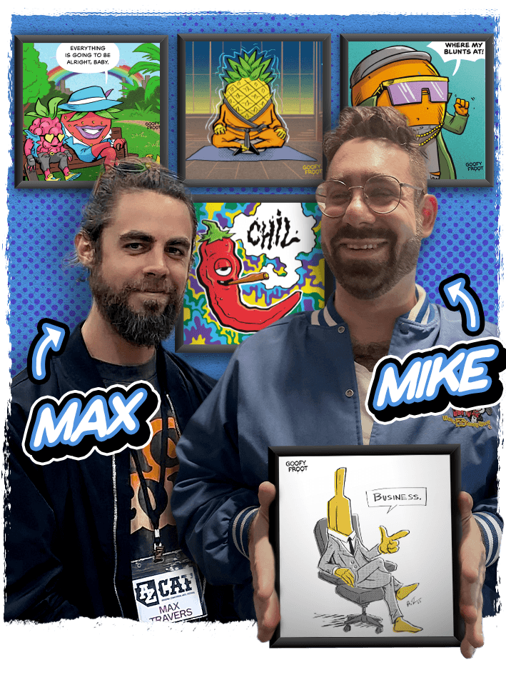 Goofy Froot is a comic book and art studio created by writer Mike Grossman and artist Max Travers. It features characters from the "Frootiverse" who are all life-sized fruits ("the froots") who have larger than life personalities. Each character represents a trait or "vibe" that we felt wasn't being given its due respect in the cartoon pantheon.